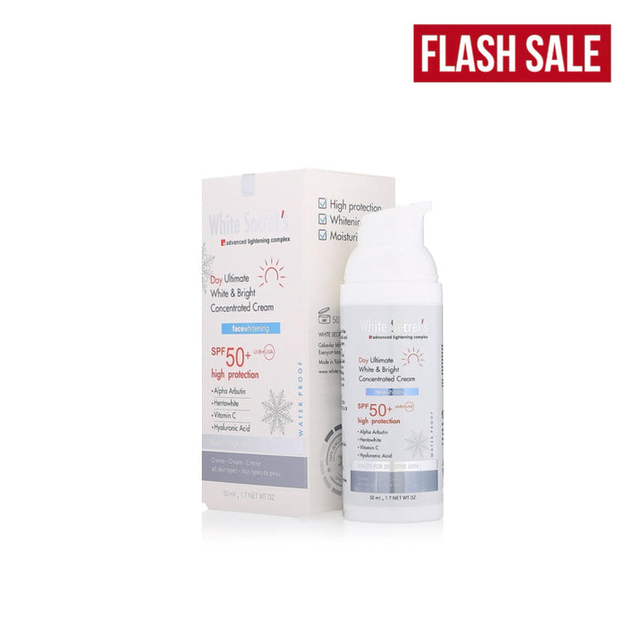 White Secrets Day Ultimate White & Bright Concentrated cream is a powerful and special skin protection and lightening cream.Developed to remove dark spots such as pigmentation, age spots or freckles and skin discoloration and hyperpigmentation. quick-absorbing formula it protect you skin from sunburns. The Formula enriched with Alpha Arbutin and ascorbic acid helps to even the skin tone. Hyaluronic acid calms and moisturizes the skin.