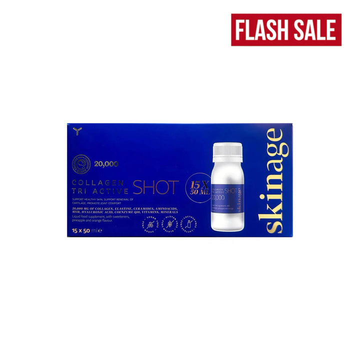 Boost your skin, nails, and hair with Skinage Collagen Tri Active Shot, a premium liquid supplement designed to promote healthy skin, joint support, and overall well-being. Each 50 ml shot contains 20,000 mg of collagen, along with key ingredients like elastin, ceramides, amino acids, MSM, hyaluronic acid, and Coenzyme Q10 to provide comprehensive skin and cartilage renewal.